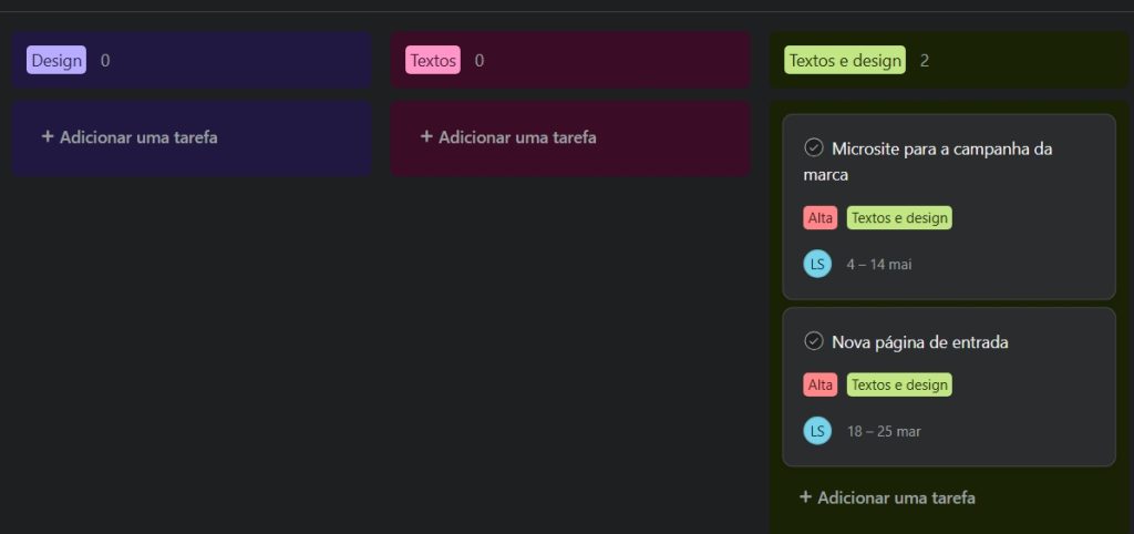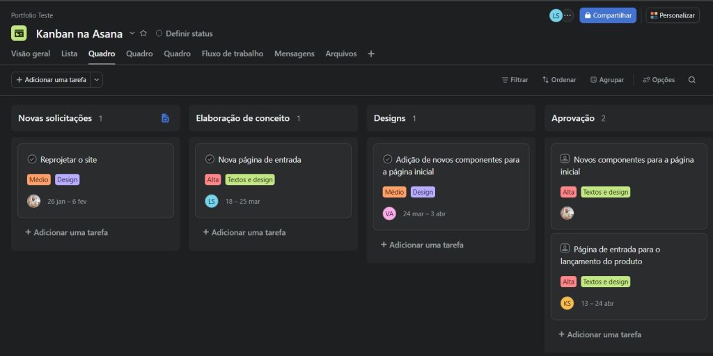 No Asana, a visualização em Painel (Board) é a tradução perfeita do Kanban. Em vez de uma lista estática, você tem colunas que representam o status da tarefa.